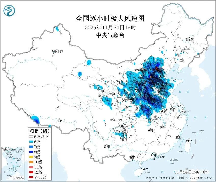 ↑ 昨天下午15时的最大阵风实况图,华北黄淮等不少地区出现8级以上最大阵风。