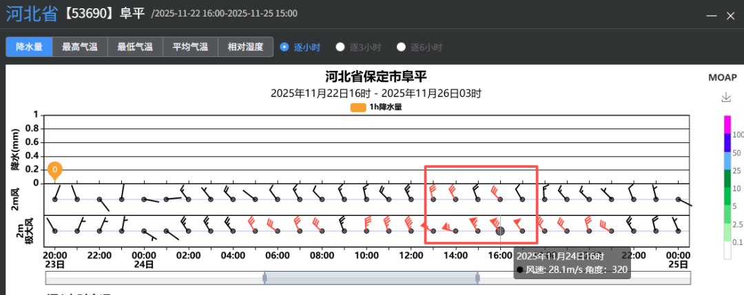 更别说昨天有的地方还刮出了10级、甚至11级的最大阵风。昨天,宁夏六盘山在04~05时阵风达到了12级(34.3米/秒),为当地11月并列第二强的阵风。此外,像河北阜平,昨天午后开始风力进一步加大,13时至17时连续5个时次出现9级及以上最大阵风,尤其16时最大阵风28.1米/秒,快接近11级暴风等级了!
